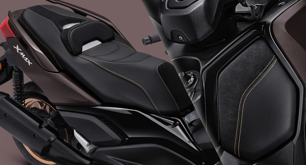 Komponen special pada XMAX Tech MAX yang kental akan nuansa premium, dapat dijumpai pada beberapa bagian sepeda motor. Pada bagian cockpit, sentuhan artistik dan mewah tersebut terletak pada komponen Jok dan juga Cover Lid Pocket yang menggunakan material sejenis kulit dengan pola jahitan beraksen emas.
